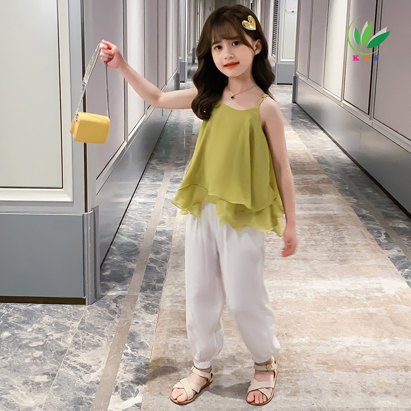 ชุดเด็กผู้หญิง Kesorn Shop เสื้อสายเดี่ยวสีเขียวและกางเกงขายาวสีขาว ชุดแฟชั่นใหม่สไตล์ตะวันตกสลิงด้านบน ผ้าฝ้ายผสม ใส่สบาย ชุดเด็กผู้หญิง สไตล์ น่ารักน่ารัก สำหรับเด็กผู้หญิง เสื้อผ้าเด็กน่ารัก เสื้อผ้าเด็ก เสื้อแขนสัน กางเกงขายาว Baby clothes Deni