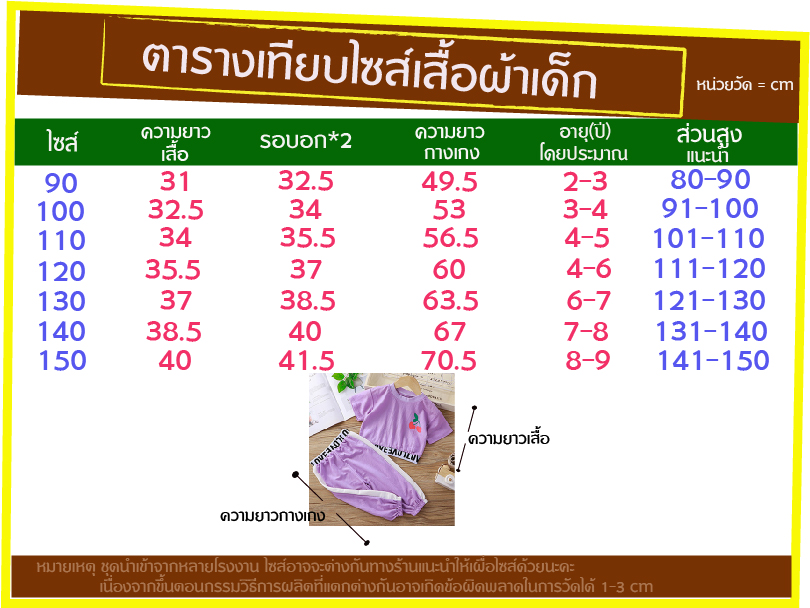 ร้าน Kesorn Shop ประเภท เสื้อยืดเด็กแขนสั้น บวก กางเกงขายาว เพศ เพศหญิง องค์ประกอบผ้า คำอธิบาย เสื้อยืดเด็กแขนสั้น ชุดเซ็ทเสื้อบวกกางเกงขายาวสุดเท่ และ ทันสมัย ผ้าใหม มีความละเอียดอ่อนและอ่อนนุ่มเวลาสวมใส่ 1-7 ปี ไซส์ 90 ส่วนสูงแนะนำ 90-100 cm ไซส์ 100 ส่วนสูงแนะนำ 101-100 cm ไซส์ 110 ส่วนสูงแนะนำ 101-110 cm ไซส์ 120 ส่วนสูงแนะนำ 111-120 cm ไซส์ 130 ส่วนสูงแนะนำ 121-130 cm ไซส์ 140 ส่วนสูงแนะนำ 131-140 cm ไซส์ 150 ส่วนสูงแนะนำ 141-150 cm การสั่งสินค้า ลูกค้าสามารถดูรายละเอียดการสั่งสินค้าได้จากตารางไซส์ซึ่งจะประกอบด้วยขนาดของเสื้อผ้า อายุ ส่วนสูงที่แนะนำ ซึ่งแนบไปพร้อมกับรูปของผลิตภัณฑ์ที่โชว์หน้า web ค่ะ แต่ข้อควรระวังคือ สินค้ามีการนำเข้าจากหลายโรงงานและมีการผลิตหลาย lot ซึ่งไซส์อาจจะแตกต่างกัน ทางร้านแนะนำให้เผื่อไซส์ด้วยนะค่ะ หรือไม่แน่ใจก็สามารถสอบถามมาที่ทางร้านก่อนก็ได้ค่ะ ![]() ![]() ![]() ![]() ![]() ![]() ![]() ![]() ![]() ![]() ![]() ![]() ![]() ![]() ![]() ![]() ![]() ![]() ![]() |