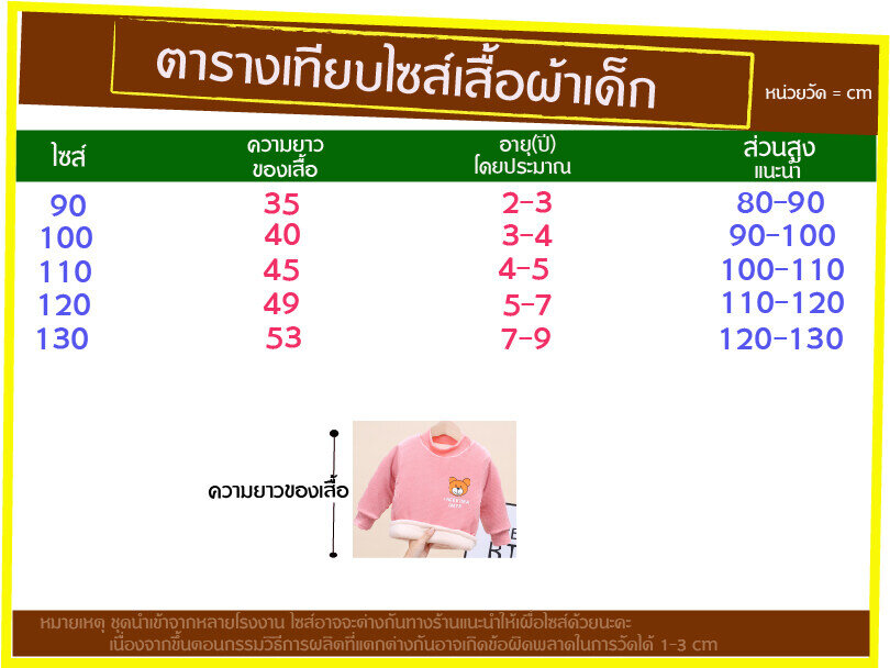 ร้าน Kesorn Shop ประเภท ชุดกันหนาวบุนวม เพศ ทั้งสองเพศ องค์ประกอบผ้า คำอธิบาย เสื้อกันหนาวบุนวม ผ้านุ่มให้ความอบอุ่นเป็นอย่างดีหนาถึง 3 ชั้น สำหรับน้องผู้หญิงและผู้ชายอายุ 2-8 ปี ไซส์ 90 ส่วนสูงแนะนำ 80-90 cm ไซส์ 100 ส่วนสูงแนะนำ 90-100 cm ไซส์ 110 ส่วนสูงแนะนำ 100-110 cm ไซส์ 120 ส่วนสูงแนะนำ 110-120 cm ไซส์ 130 ส่วนสูงแนะนำ 120-130 cm การสั่งสินค้า ลูกค้าสามารถดูรายละเอียดการสั่งสินค้าได้จากตารางไซส์ซึ่งจะประกอบด้วยขนาดของเสื้อผ้า อายุ ส่วนสูงที่แนะนำ ซึ่งแนบไปพร้อมกับรูปของผลิตภัณฑ์ที่โชว์หน้า web ค่ะ แต่ข้อควรระวังคือ สินค้ามีการนำเข้าจากหลายโรงงานและมีการผลิตหลาย lot ซึ่งไซส์อาจจะแตกต่างกัน ทางร้านแนะนำให้เผื่อไซส์ด้วยนะค่ะ หรือไม่แน่ใจก็สามารถสอบถามมาที่ทางร้านก่อนก็ได้ค่ะ