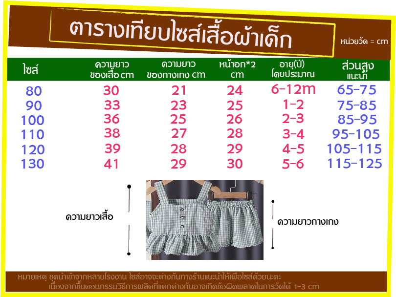 ลูกค้าสามารถดูรายละเอียดการสั่งสินค้าได้จากตารางไซส์ซึ่งจะประกอบด้วยขนาดของเสื้อผ้า อายุ ส่วนสูงที่แนะนำ ซึ่งแนบไปพร้อมกับรูปของผลิตภัณฑ์ที่โชว์หน้า web ค่ะ แต่ข้อควรระวังคือ สินค้ามีการนำเข้าจากหลายโรงงานและมีการผลิตหลาย lot ซึ่งไซส์อาจจะแตกต่างกัน ทางร้านแนะนำให้เผื่อไซส์ด้วยนะค่ะ หรือไม่แน่ใจก็สามารถสอบถามมาที่ทางร้านก่อนก็ได้ค่ะ