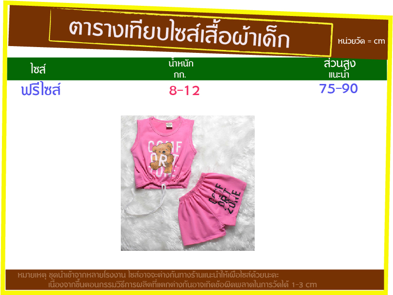 ไซส์ ฟรีไซส์ ส่วนสูงแนะนำ 75-90 cm น้ำหนัง 8-12 กก