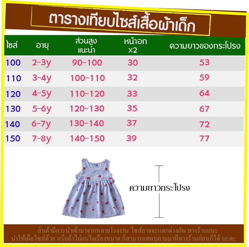 ร้าน Kesorn Shop ประเภท ชุดกระโปรงเด็ก เสื้อแขนกุดและกระโปรง เพศ หญิง องค์ประกอบผ้า ผ้าฝ้าย คำอธิบาย ชุดกระโปรงเด็กผู้หญิงผ้าฝ้าย ลายลูกไม้ มีสายรัดด้านหลังสไตล์เกาหลี ผ้านุ่มใส่สบาย เหมาะกับภูมิประเทศเขตร้อนอย่างบ้านเรา สไตล์น่ารัก น่ารัก ลูกค้าสามารถดูรายละเอียดการสั่งสินค้าได้จากตารางไซส์ซึ่งจะประกอบด้วยขนาดของเสื้อผ้า อายุ ส่วนสูงที่แนะนำ ซึ่งแนบไปพร้อมกับรูปของผลิตภัณฑ์ที่โชว์หน้า web ค่ะ แต่ข้อควรระวังคือ สินค้ามีการนำเข้าจากหลายโรงงานและมีการผลิตหลาย lot ซึ่งไซส์อาจจะแตกต่างกัน ทางร้านแนะนำให้เผื่อไซส์ด้วยนะค่ะ หรือไม่แน่ใจก็สามารถสอบถามมาที่ทางร้านก่อนก็ได้ค่ะ ขนาด ไซส์ 100, ส่วนสูงแนะนำ 95-100 ซม ไซส์ 110 , ส่วนสูงแนะนำ 100-110 ซม ไซส์ 120, ส่วนสูงแนะนำ 110-120 ซม ไซส์ 130 , ส่วนสูงแนะนำ 120-130 ซม ไซส์ 140, ส่วนสูงแนะนำ 130-140 ซม ไซส์ 150, ส่วนสูงแนะนำ 140-150 ซม ร้าน KesornShop #ชุดนอนเด็ก #ชุดนอนเด็กขายาว #ชุดนอนเด็กแขนยาว #ชุดเด็กน่ารัก #ชุดเด็กราคาถูก #ชุดนอนลายการ์ตูน #ชุดนอนเด็กผู้หญิง #ชุดนอนเด็กผู้ชาย #ชุดนอนเด็กราคาถูก #ชุดนอนเด็กเล็ก #ชุดแขนยาวเด็ก #ชุดเด็กคุณภาพดี #ชุดเด็กราคาถูก #ชุดแขนยาว #เสื้อผ้าเด็ก #เสื้อผ้าเด็กน่ารัก #เสื้อผ้าเด็กผู้หญิง #เสื้อผ้าเด็กผู้ชาย