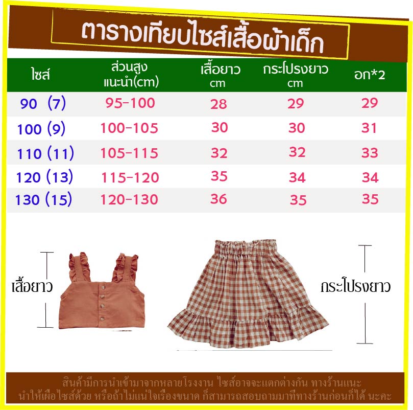 ร้าน Kesorn Shop ประเภท ชุดเด็กผู้หญิง สายเดี่ยวกระโปรงลายสก๊อตA เพศ หญิง องค์ประกอบผ้า คำอธิบาย ชุดเด็กผู้หญิงสายเดี่ยวลายสก๊อต เหมาะกับภูมิประเทศเขตร้อนอย่างบ้านเรา สไตล์น่ารัก น่ารัก ลูกค้าสามารถดูรายละเอียดการสั่งสินค้าได้จากตารางไซส์ซึ่งจะประกอบด้วยขนาดของเสื้อผ้า อายุ ส่วนสูงที่แนะนำ ซึ่งแนบไปพร้อมกับรูปของผลิตภัณฑ์ที่โชว์หน้า web ค่ะ แต่ข้อควรระวังคือ สินค้ามีการนำเข้าจากหลายโรงงานและมีการผลิตหลาย lot ซึ่งไซส์อาจจะแตกต่างกัน ทางร้านแนะนำให้เผื่อไซส์ด้วยนะค่ะ หรือไม่แน่ใจก็สามารถสอบถามมาที่ทางร้านก่อนก็ได้ค่ะ ขนาด ไซส์ 90 (7), ส่วนสูงแนะนำ 95-100 ซม ไซส์ 100 (9) , ส่วนสูงแนะนำ 100-105 ซม ไซส์ 110 (11), ส่วนสูงแนะนำ 105-115 ซม ไซส์ 120 (13) , ส่วนสูงแนะนำ 115-120 ซม ไซส์ 130 (15) , ส่วนสูงแนะนำ 120-130 ซม ร้าน KesornShop #ชุดนอนเด็ก #ชุดนอนเด็กขายาว #ชุดนอนเด็กแขนยาว #ชุดเด็กน่ารัก #ชุดเด็กราคาถูก #ชุดนอนลายการ์ตูน #ชุดนอนเด็กผู้หญิง #ชุดนอนเด็กผู้ชาย #ชุดนอนเด็กราคาถูก #ชุดนอนเด็กเล็ก #ชุดแขนยาวเด็ก #ชุดเด็กคุณภาพดี #ชุดเด็กราคาถูก #ชุดแขนยาว #เสื้อผ้าเด็ก #เสื้อผ้าเด็กน่ารัก #เสื้อผ้าเด็กผู้หญิง #เสื้อผ้าเด็กผู้ชาย